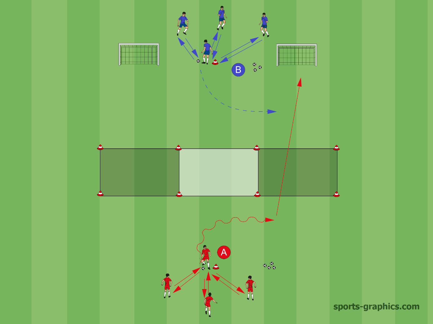 A passing game ending in a 1 on 1 duel in front of a mini goal, developing spatial thinking and individual skills.