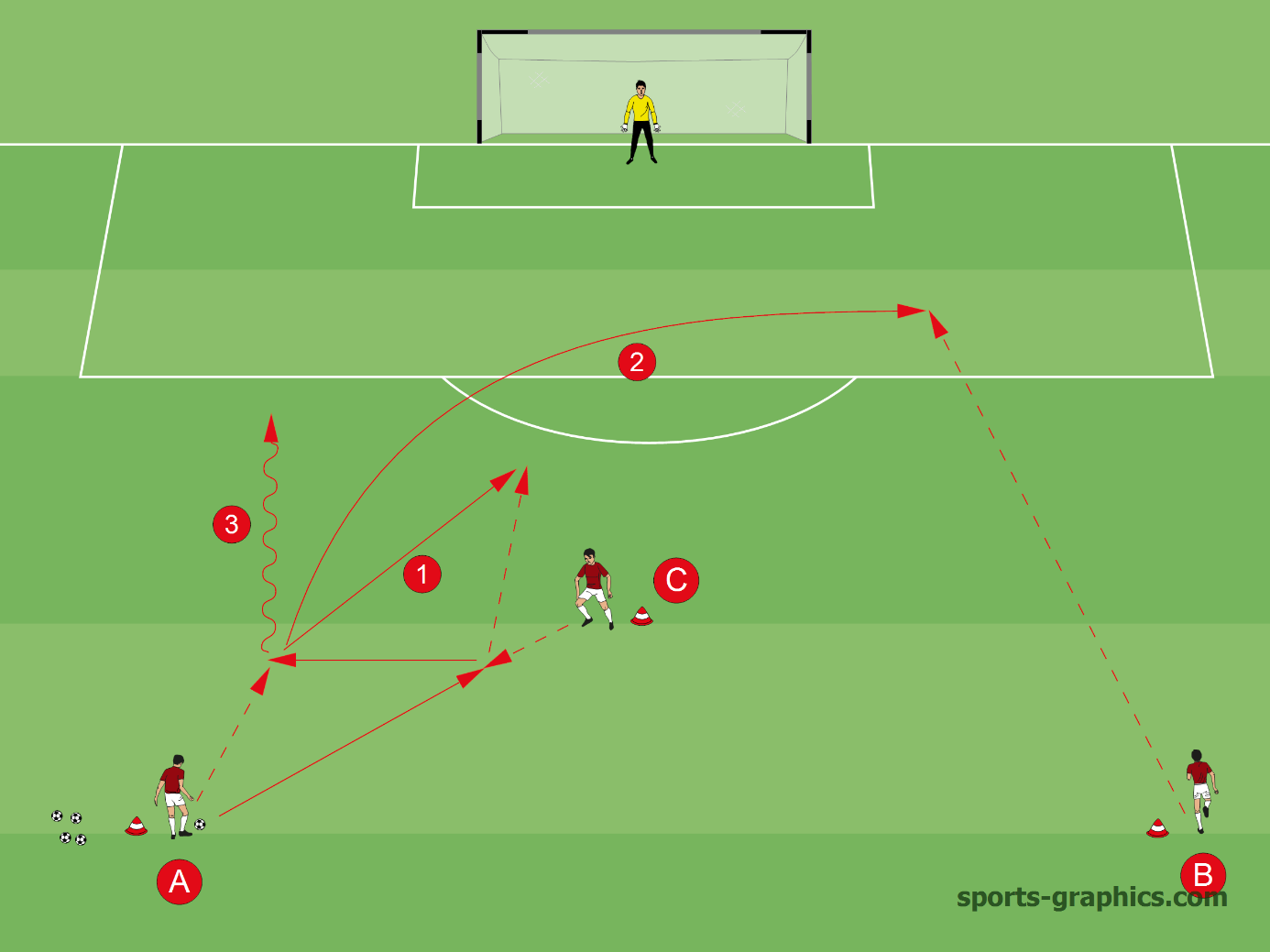 A fast-paced combination play drill focusing on central passes and quick finishing to improve team coordination.